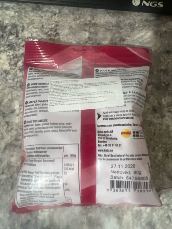 Azúcar, jarabe de glucosa, almidón, agua, acidulante (ácido cítrico), aromas naturales, colorante (E153).