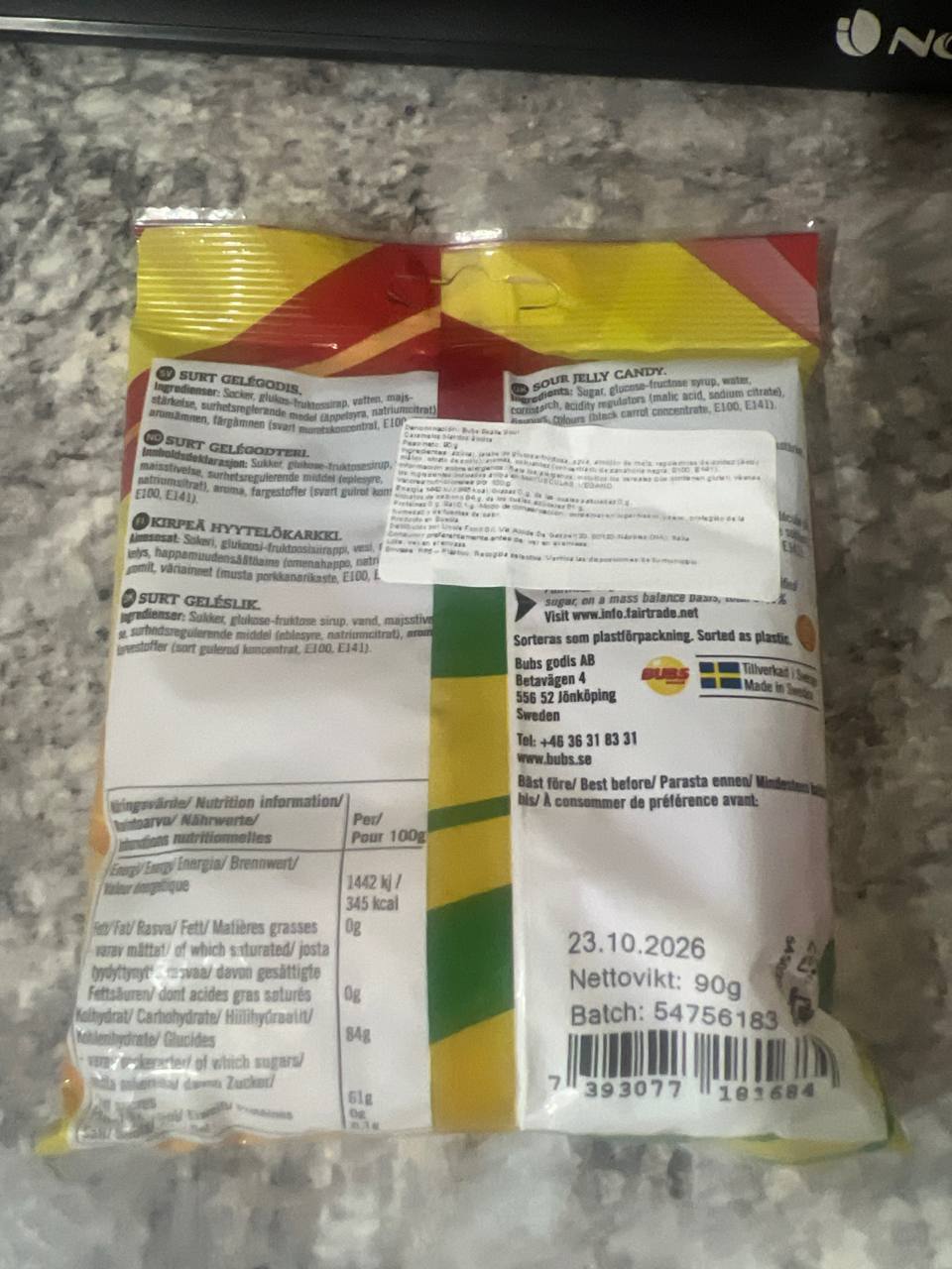 Bolsa de 90 g de caramelos gomosos ácidos.