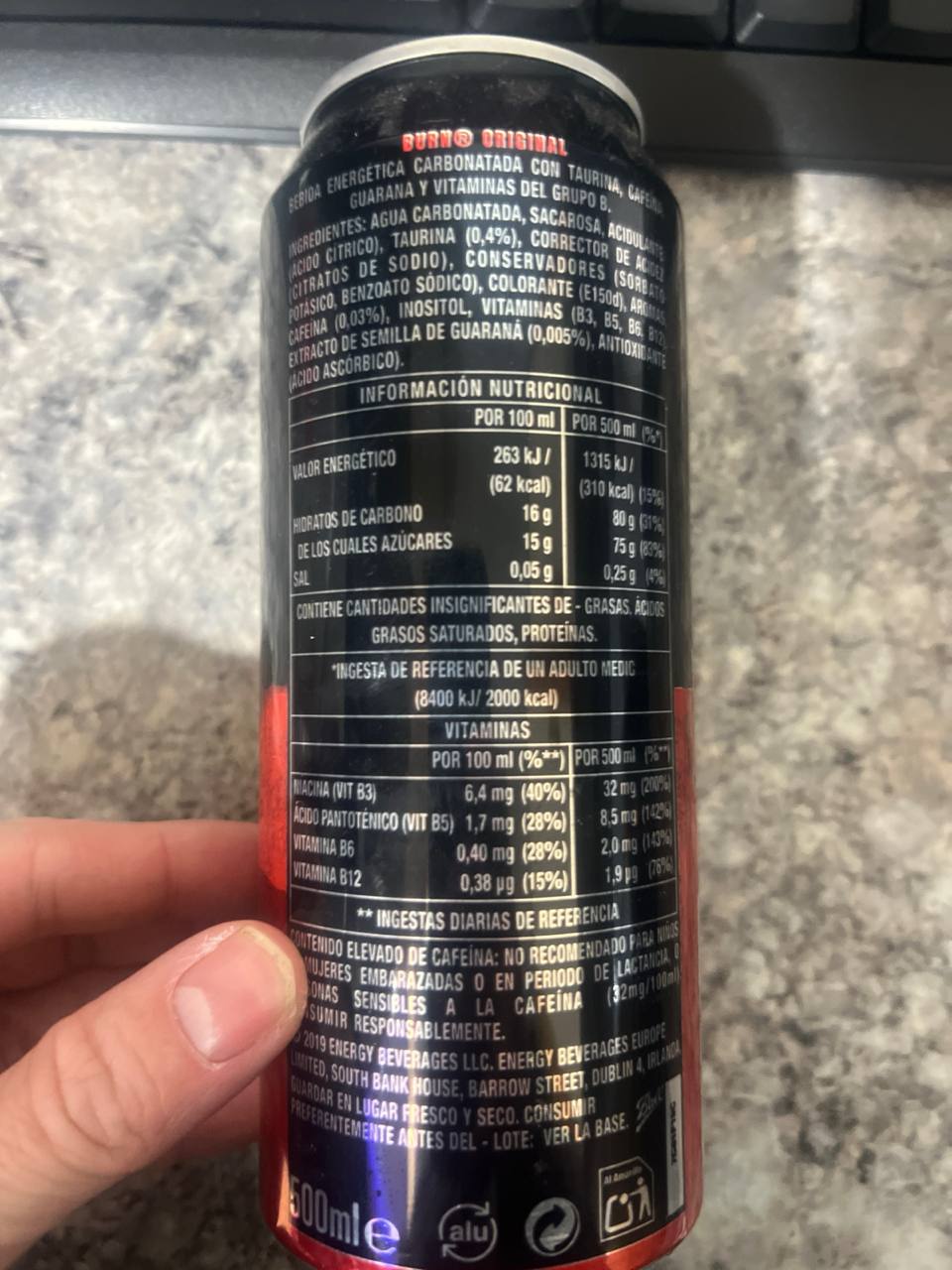 La Burn Energy Original es una bebida energética con gas diseñada para darte el impulso que necesitas cuando más lo requieres. Su sabor dulce y afrutado, combinado con cafeína, taurina y vitaminas del grupo B, te ayuda a mantenerte activo, enfocado y lleno de energía. ????????