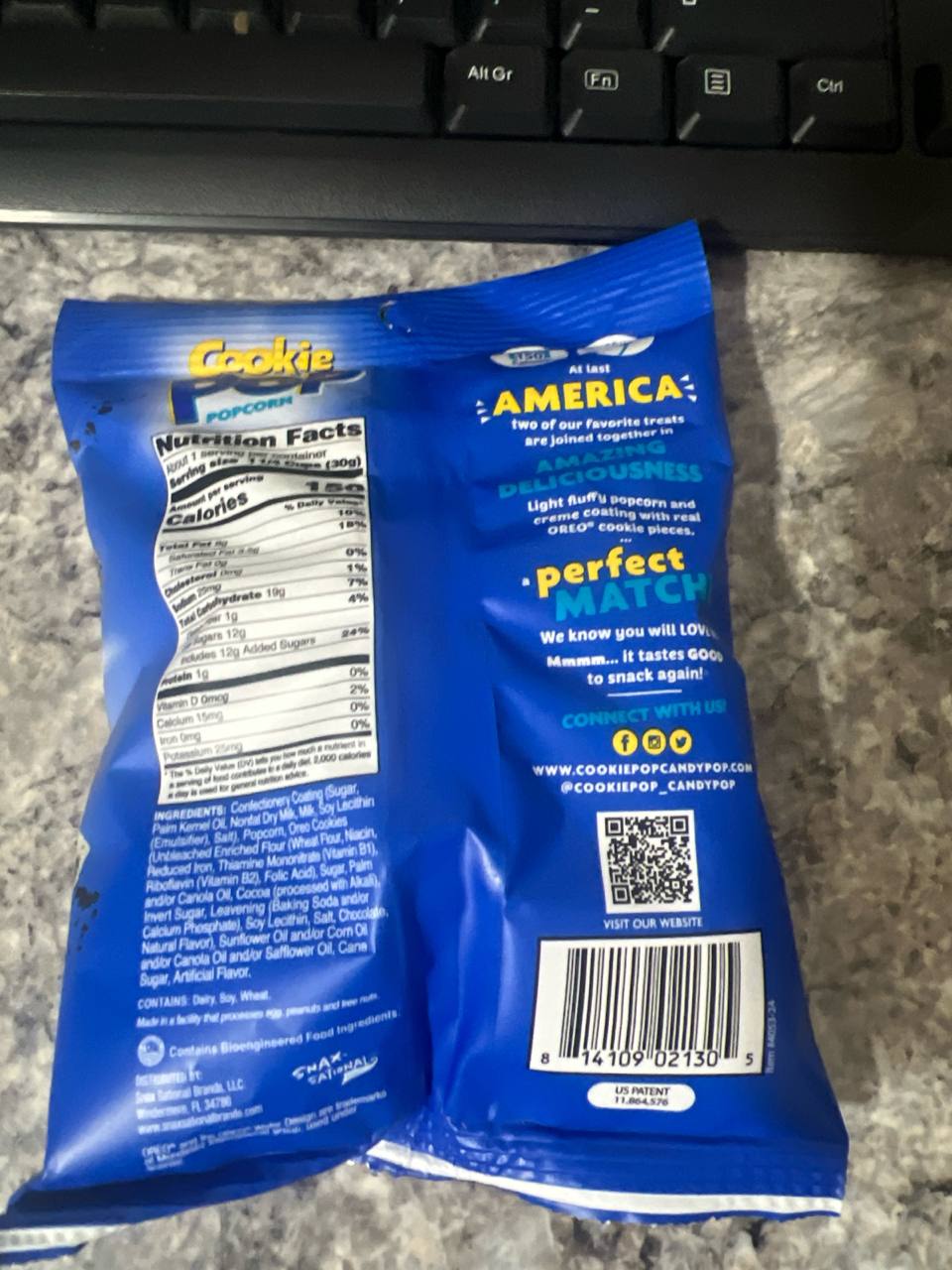 Glaseado (azúcar, aceite de palmiste, leche desnatada en polvo, leche, lecitina de soja (emulsionante), sal), palomitas de maíz, trozos de galleta OREO (harina sin blanquear enriquecida [harina de TRIGO, niacina, hierro reducido, mononitrato de tiamina (vitamina B1), riboflavina (vitamina B2), ácido fólico], azúcar, aceite de palma o de canola, cacao (procesado con álcali), azúcar invertido, leudantes (bicarbonato de sodio o fosfato de calcio), lecitina de soja, sal, chocolate, aromas naturales), aceite de girasol, maíz, canola o cártamo, azúcar de caña, aroma artificial. Alérgenos: Para conocer los alérgenos, incluidos los cereales que contienen gluten, consulte los ingredientes en MAYÚSCULAS arriba. Puede contener HUEVOS, CACAHUATES y FRUTOS SECOS.