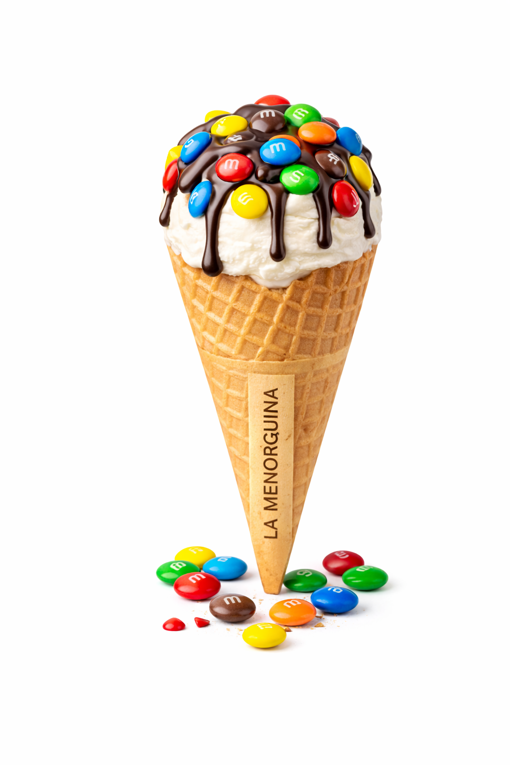 Helado con chocolate y topping de M&M’s en cono crujiente.