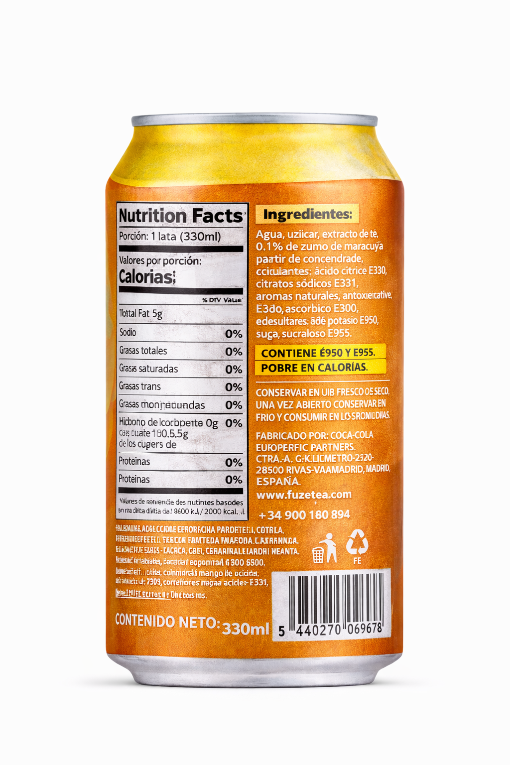 Agua, azúcar, extracto de té, zumo de maracuyá a partir de concentrado, acidulantes (E330 ácido cítrico, E331), aromas naturales, antioxidante (E300 ácido ascórbico), edulcorantes (E950 acesulfamo K, E955 sucralosa).