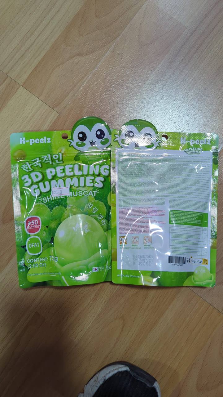 Los K-Peelz 3D Peeling Gummies Shine Muscat son unas innovadoras gominolas coreanas diseñadas para disfrutarse pelándolas capa por capa, igual que una fruta real. Su textura es suave, jugosa y tridimensional, con un sabor intenso y aromático a uva Shine Muscat, una de las variedades más dulces y apreciadas de Asia.