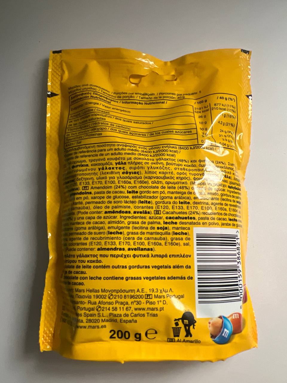 Azúcar, cacahuetes, leche en polvo, manteca de cacao, pasta de cacao, almidón, grasa de palma, lactosa, suero de leche, emulgente (lecitina de soja), sal, agentes de recubrimiento (E414, E903), colorantes (E100, E120, E133, E160a, E160e), aroma.