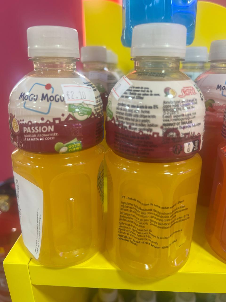 El Mogu Mogu Passion Fruit 320ml es una bebida tailandesa exótica que combina el intenso sabor tropical del maracuyá (passion fruit) con divertidos trocitos de nata de coco (Nata de Coco) que aportan una textura única y sorprendente. Su equilibrio entre dulzor y acidez convierte cada sorbo en una experiencia refrescante y diferente.