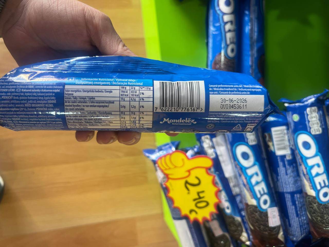 Harina de trigo, azúcar, huevo, aceite vegetal, cacao en polvo, chocolate, relleno sabor Oreo (azúcar, grasas vegetales, cacao, aroma), leche en polvo, jarabe de glucosa, emulgentes, agentes gasificantes, sal, aromas.