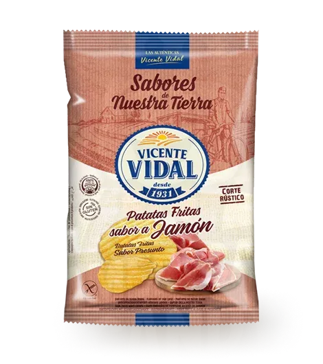 Disfruta de Vicente Vidal Sabor Jamón, unas deliciosas patatas fritas crujientes con el clásico e intenso sabor a jamón.