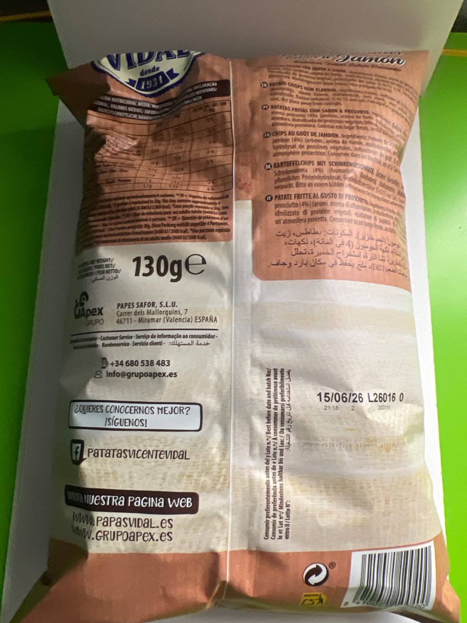 Patatas, aceite de girasol (≈33–36%), aroma de jamón (4%)