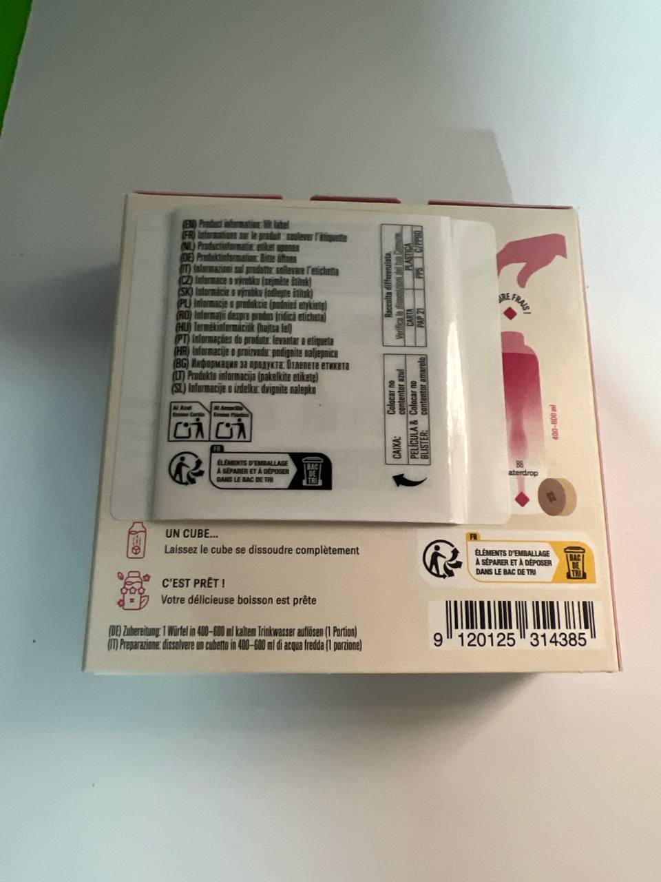 Ácido cítrico, extracto de té, extracto de frambuesa, jugo de frutas en polvo, carbonato de sodio, aromas naturales, edulcorantes (sucralosa, glucósidos de esteviol), colorantes naturales, sales minerales.